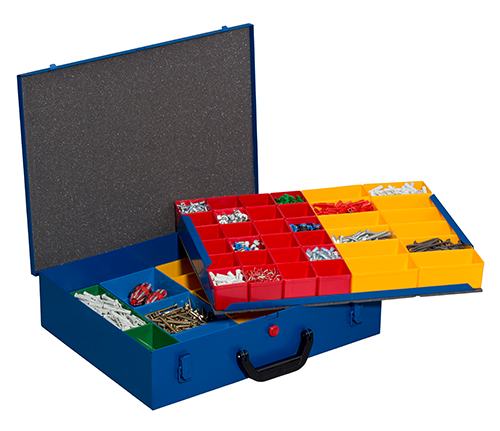 Stabile Kleinteilekoffer aus pulverbeschichtetem Stahlblech in dunkelblau für den sicheren und geschützten Transport von Kleinteilen und Zubehör. In verschiedenen Größen und Bestückungsvarianten oder als individuell bestückbarer Leerkoffer.