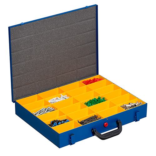 Stabile Kleinteilekoffer aus pulverbeschichtetem Stahlblech in dunkelblau für den sicheren und geschützten Transport von Kleinteilen und Zubehör. In verschiedenen Größen und Bestückungsvarianten oder als individuell bestückbarer Leerkoffer.