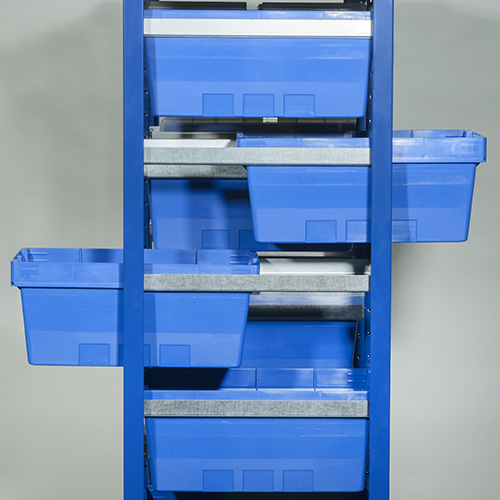- Behälterregal bietet durch flexible Einteilung der Schienen mehr Platz als ein Wagen mit Regalböden